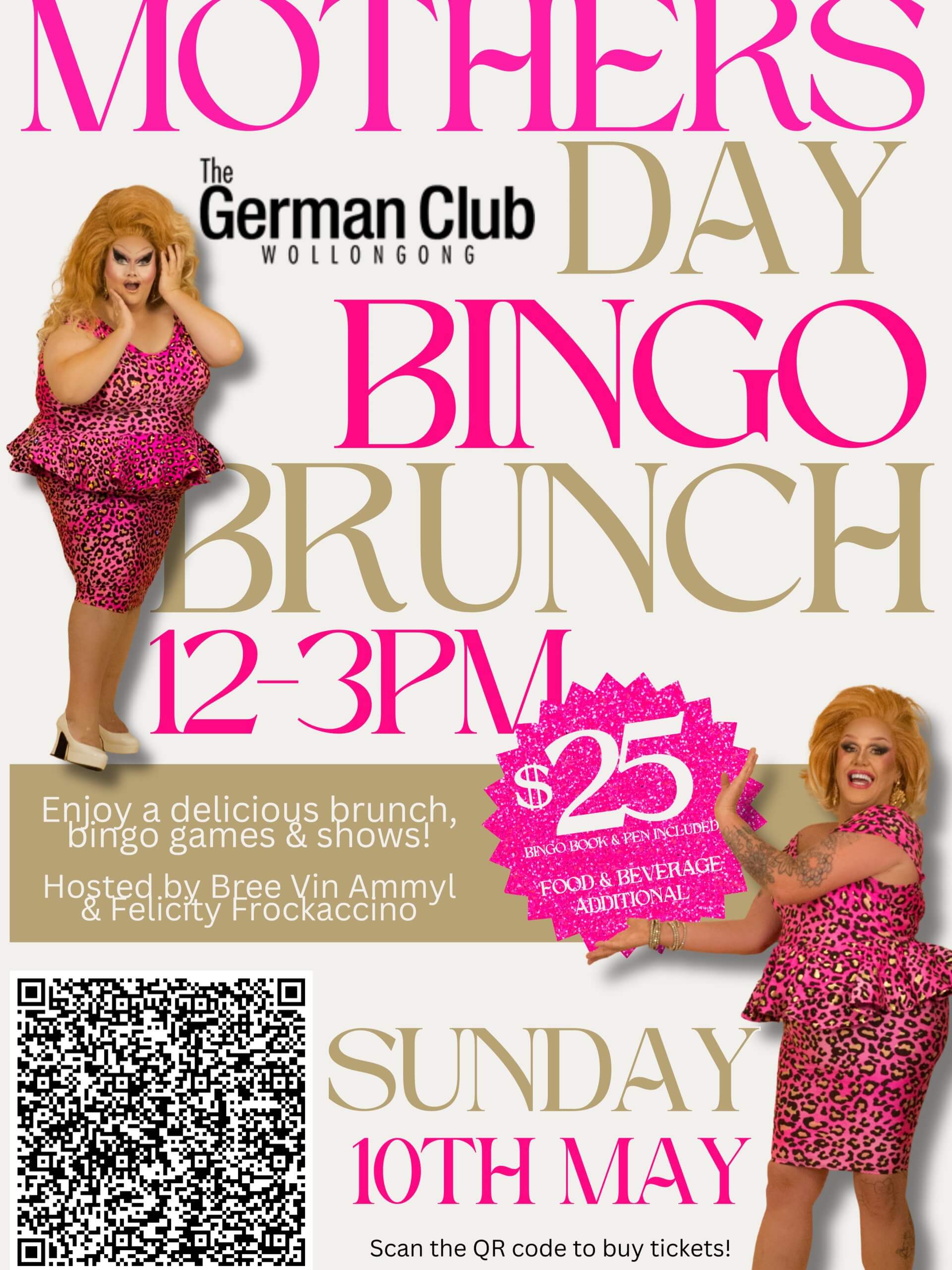Join us for a fun-filled afternoon of drag, bingo, and brunch vibes hosted by the iconic Bree Vin-Ammyl & Felicity Frockachinno! Expect laughs, outrageous performances, and some gorgeous prizes up for grabs